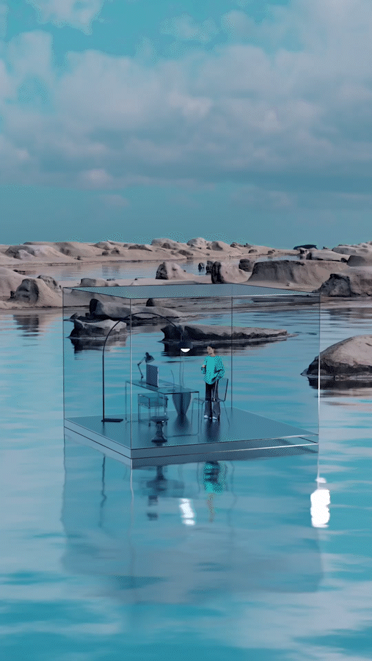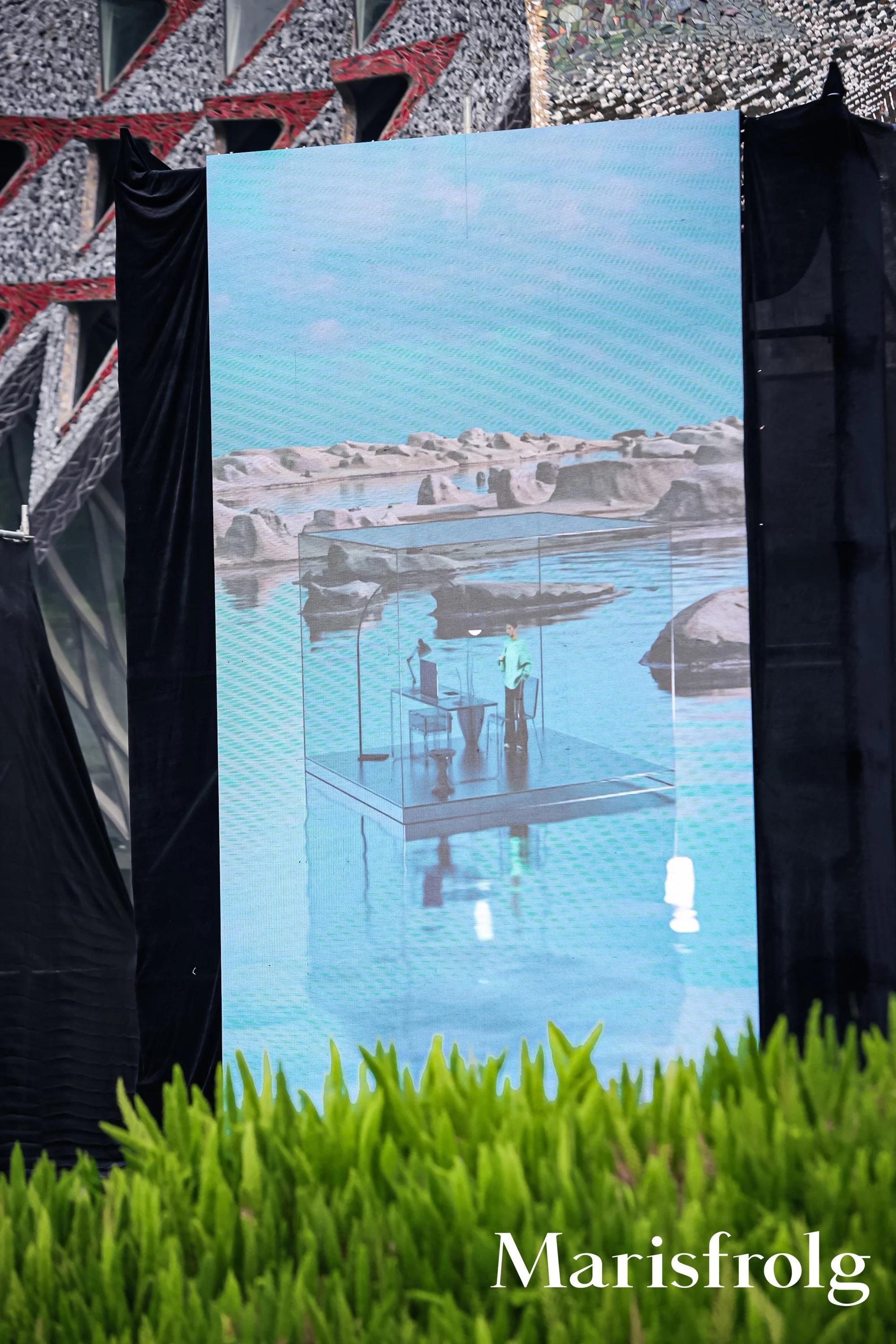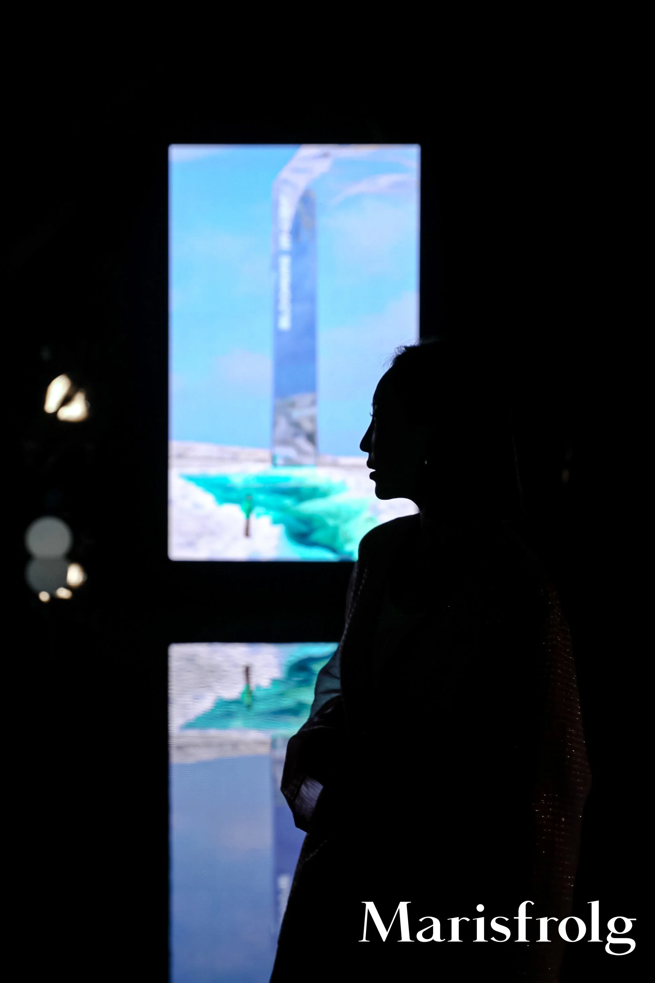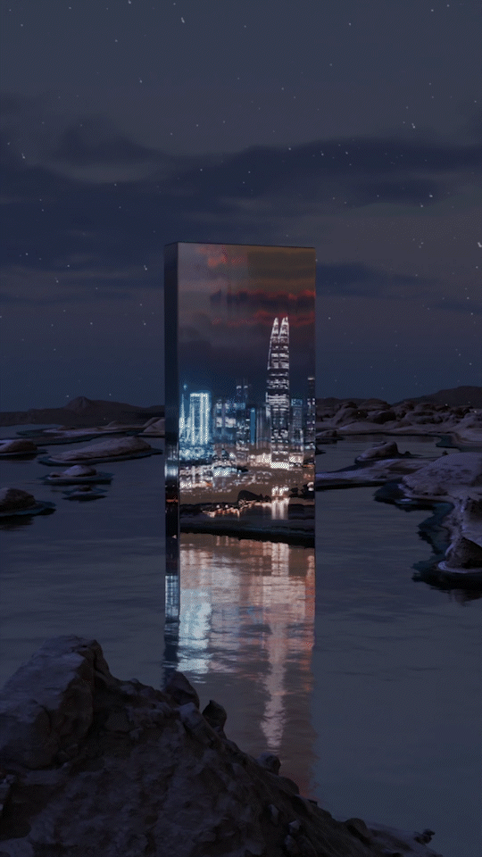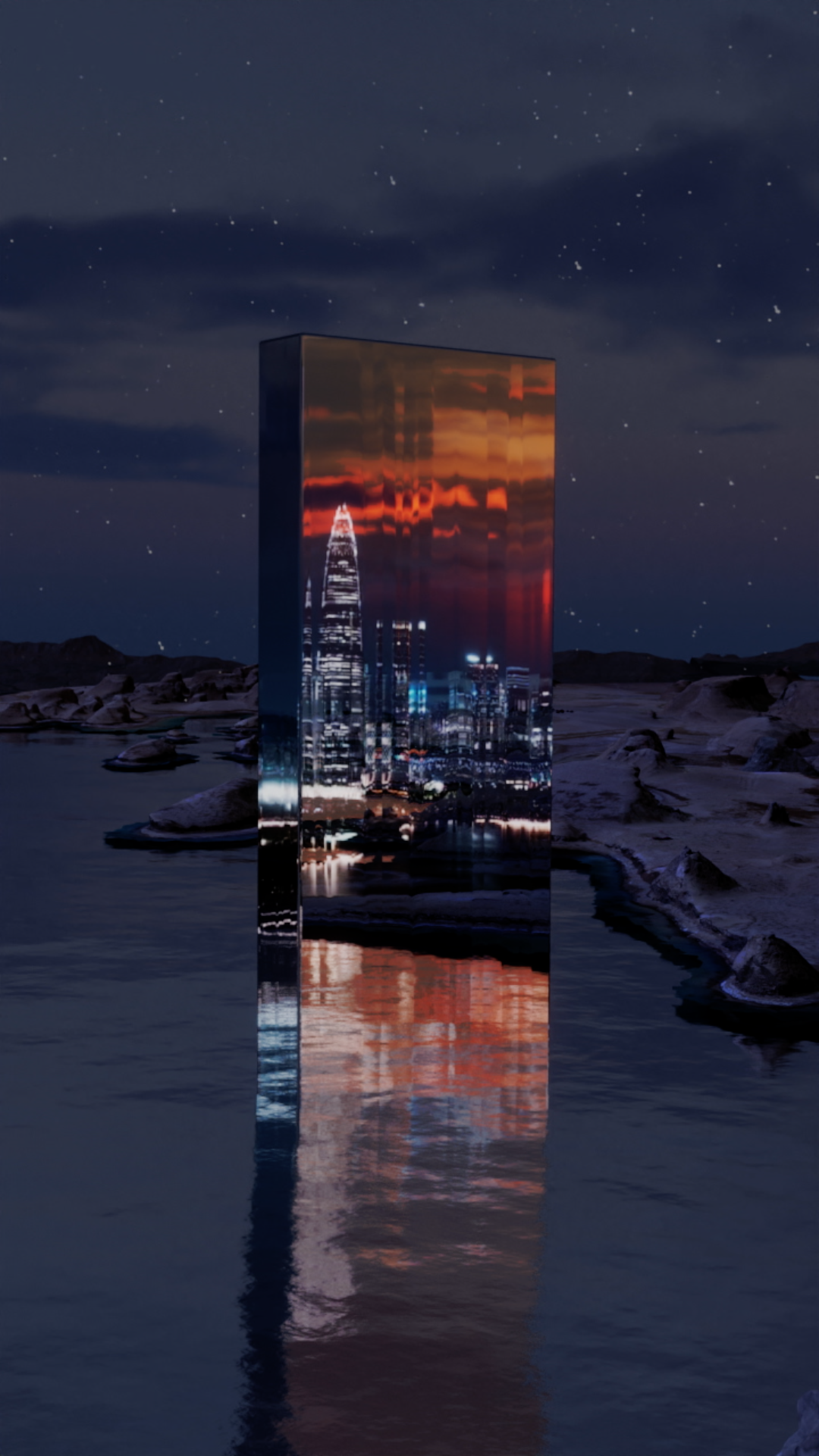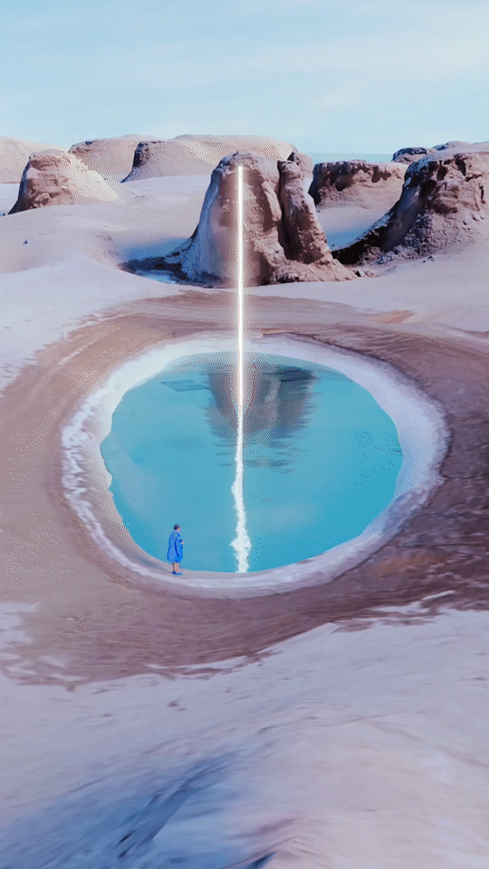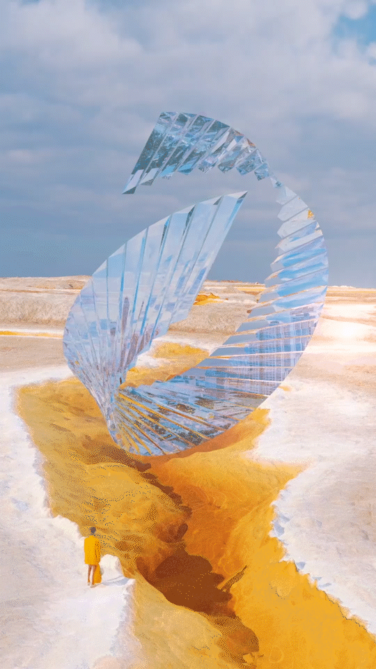 严谨的科技感技术与感性的自由艺术融合,艺术家采用空中三维激光捕捉与扫描技术,将Marisfrolg 2022 秋冬时装秀场-青海大柴旦雅丹和盐湖的地貌反正复刻定制,构建一个全新的虚拟自然世界。我们希望通过“光”,在这个世界里创建一个连结都市和自然的“光体传送门”,同时它也是一个多维的雕塑反光体。在都市与自然的链接过程中,因光的折射、反射与散射等物理变化,“光体传送门”将创造出新的反射光面,形成一个半实半虚的“光体雕塑”,在无限地循环运转中,犹如抵达充满光明的异次元空间。