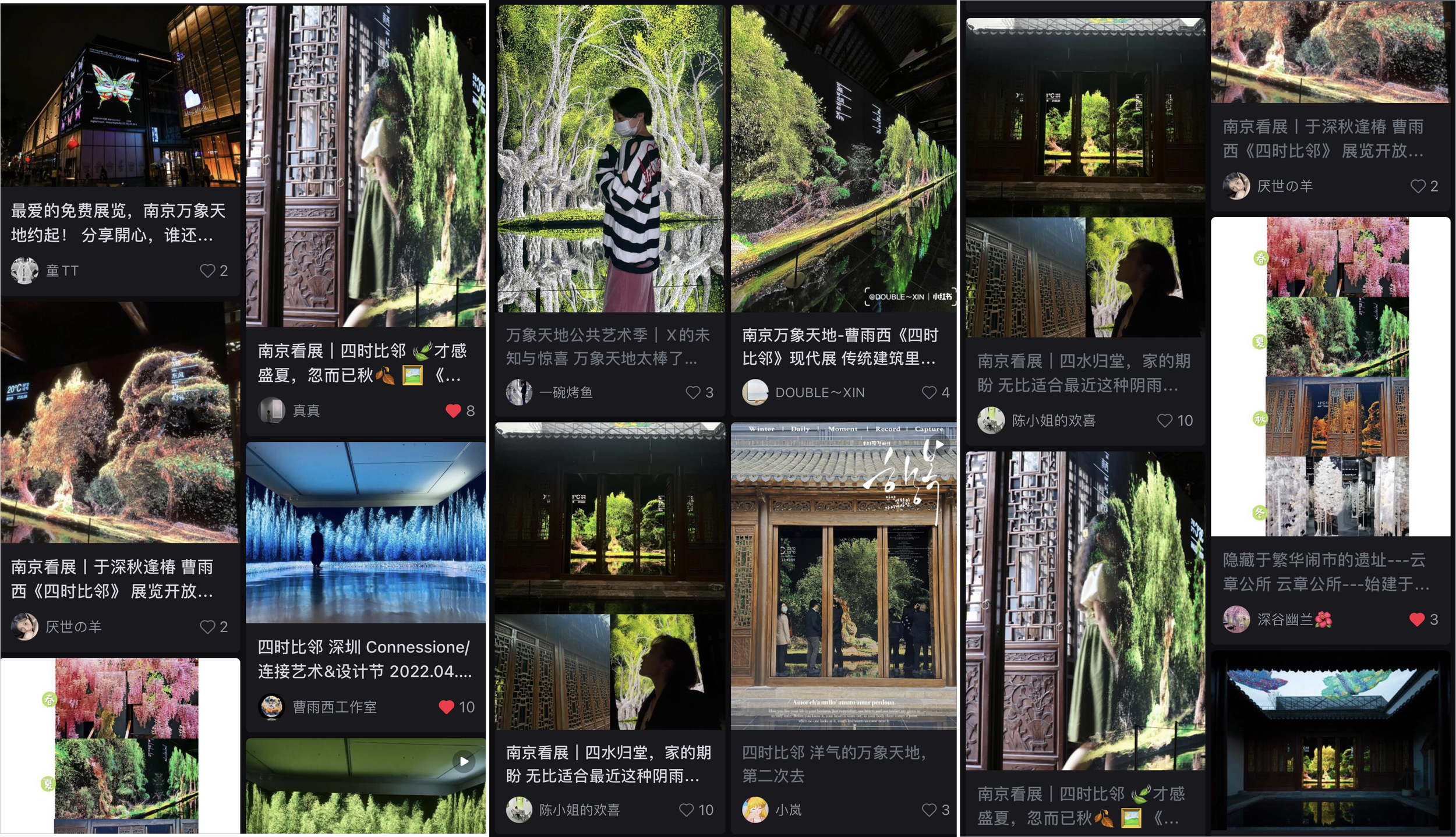 In "Seasonal Promixities", the viewer is surrounded by trees constructed by digital images, and the familiar trees form a wonderful collision with the unfamiliar expressions, as if entering the "forest in the city", and Yunzhang Public Hall becomes a place where rational technology and sensual memories merge. The rotation of the seasons of the trees in Nanjing City is activated by technology to give a new experience and a different kind of vitality.