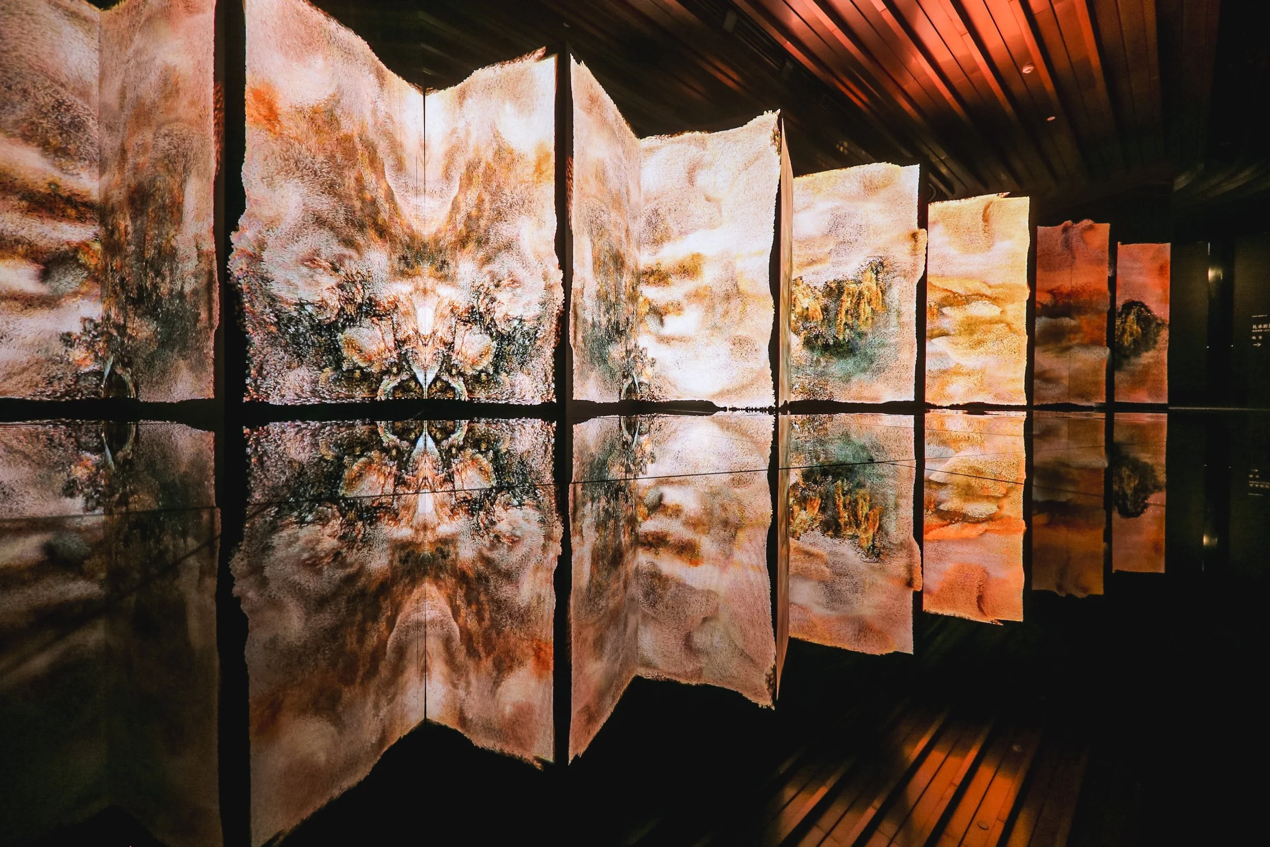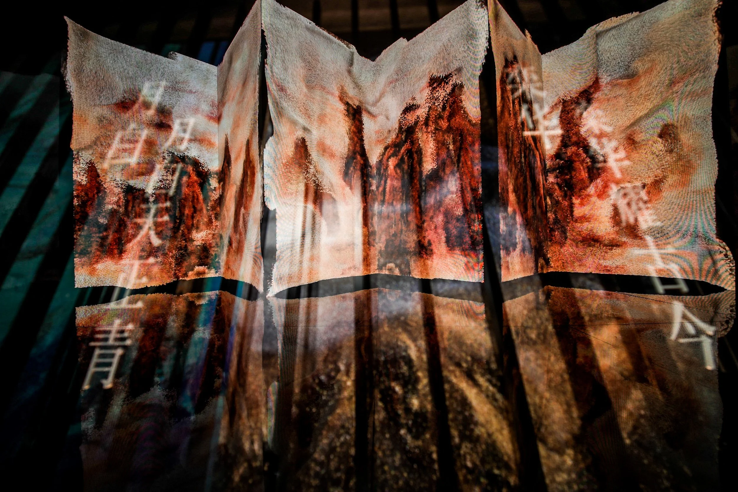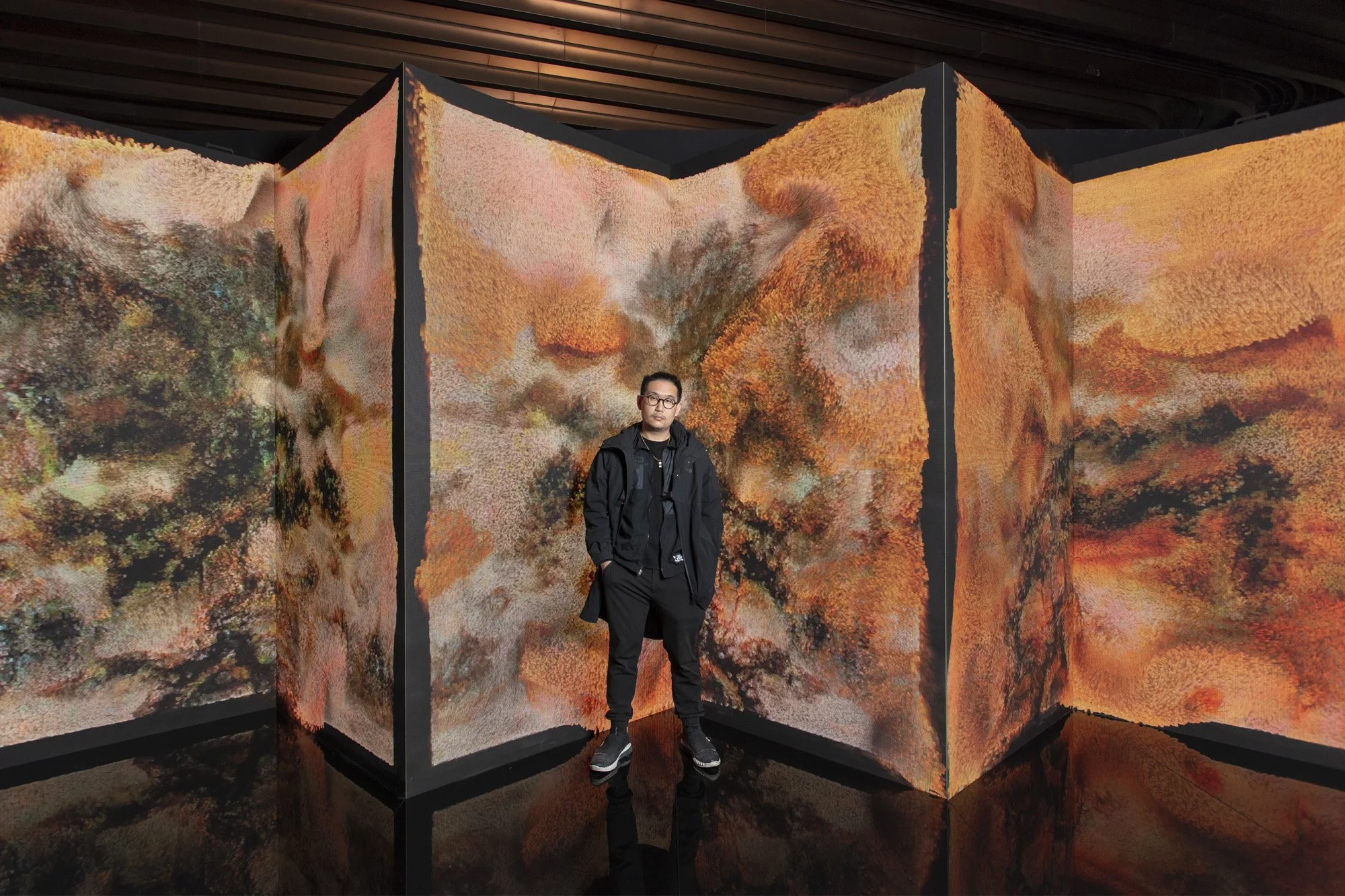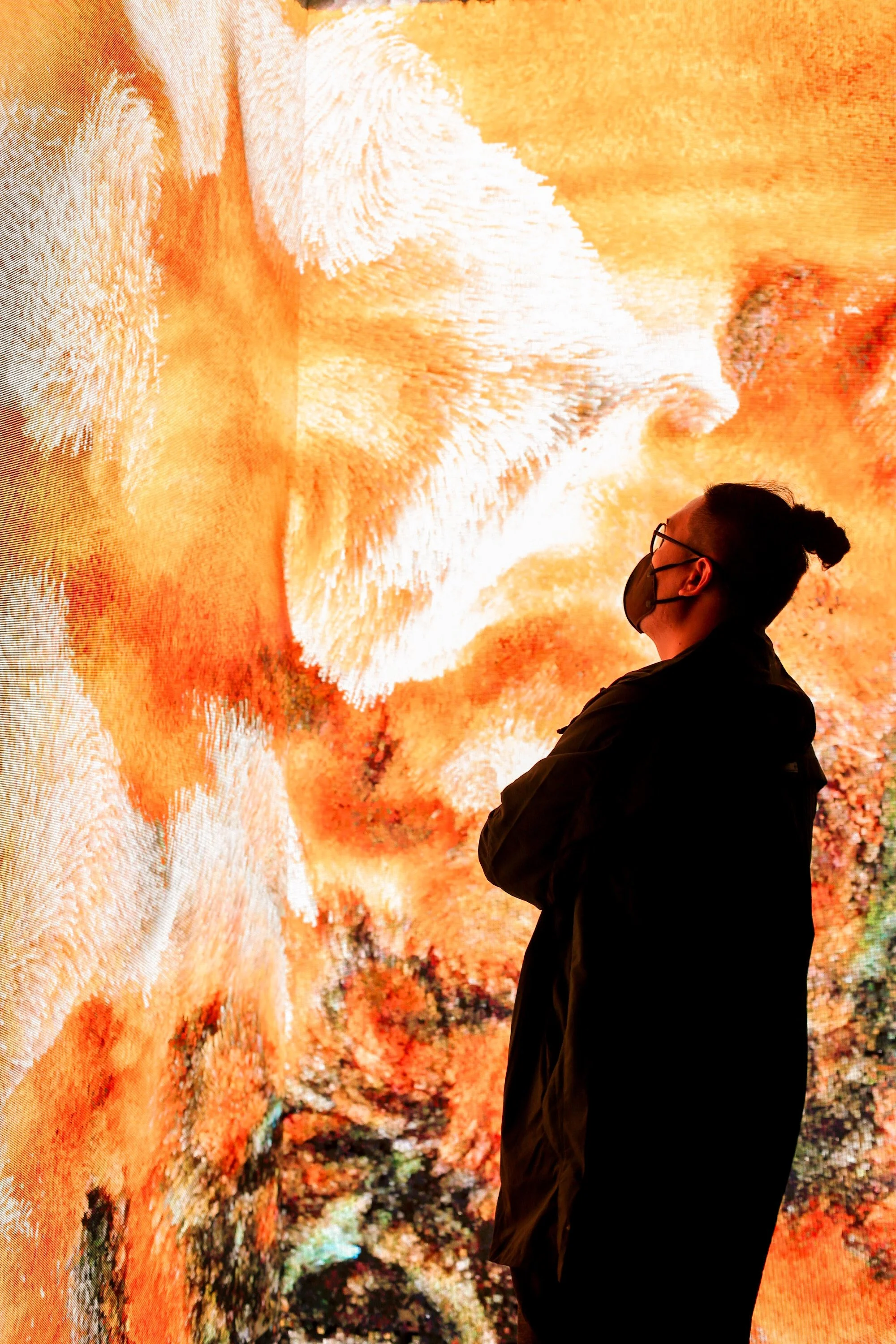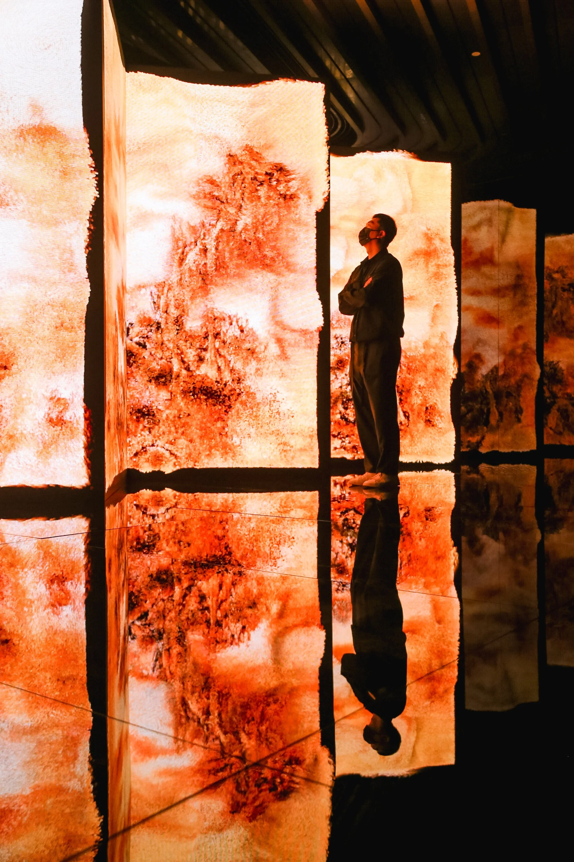 曹雨西的创作在科技的赋能下展现出一种生长,水墨粒子实时流动,形成一幅幅无限演变的景观。源自《山海经·大荒南经》的“栾华”,即传说中的神木华彩“栾木之华”,也彰显着生长中蕴含的优雅、尊崇与气度。他用当代技术把古人绘画中难以表现的云雾缭绕、重岩叠嶂、千岩竞秀的壮丽奇幻之景象表现出来,也让观众在数字科技和东方美学碰撞出的全新火花中沉浸着。